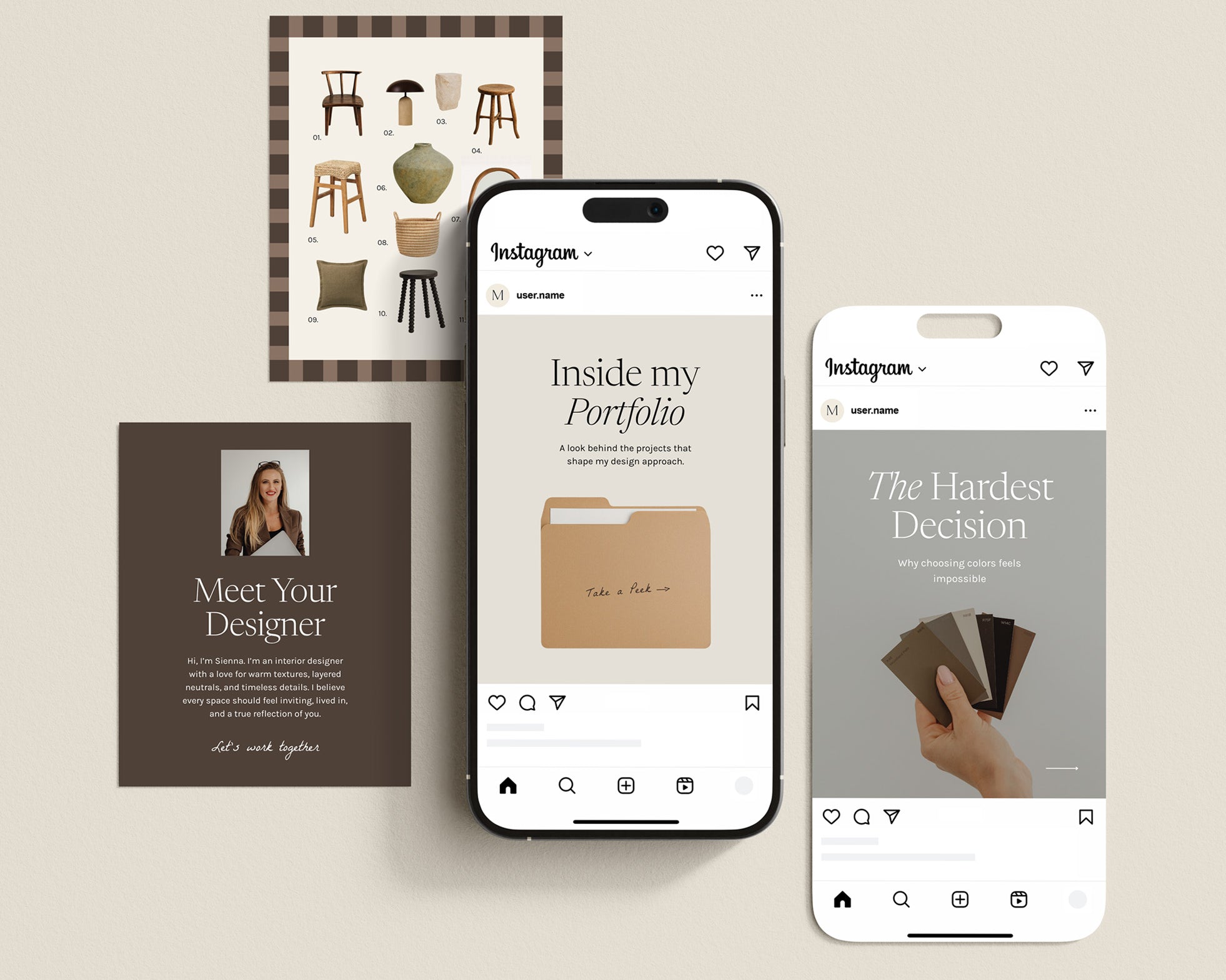 Designed for interior designers and stylists, this Canva template pack makes it simple to share your work beautifully. With 130 minimal, editorial-style templates for projects, services, testimonials, and moodboards, it’s your go-to toolkit for a cohesive and professional feed.