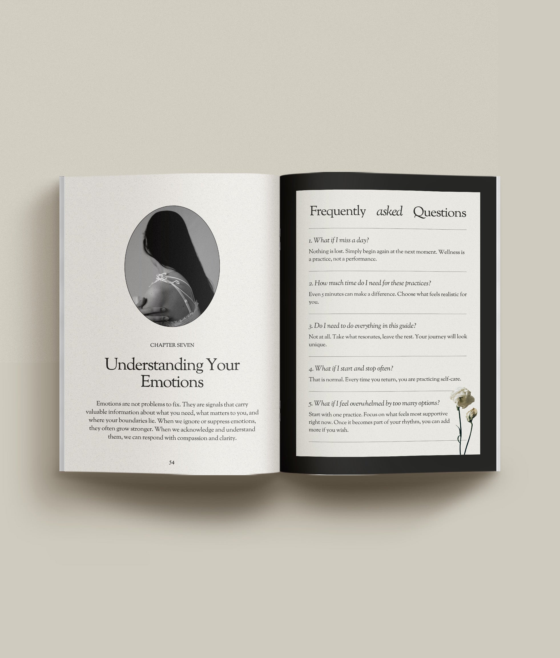 • Structured chapters on stress relief, nutrition, hydration, sleep, movement, emotions, self-care, relationships, and more